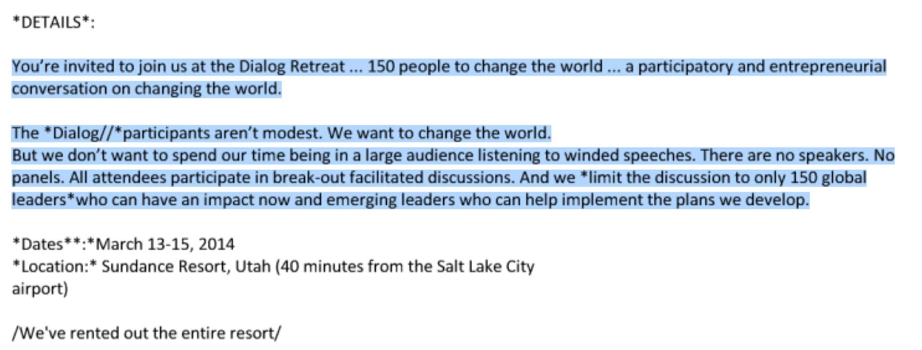 You’re invited to join us at the Dialog Retreat ... 150 people to change the world ... a participatory and entrepreneurial conversation on changing the world.