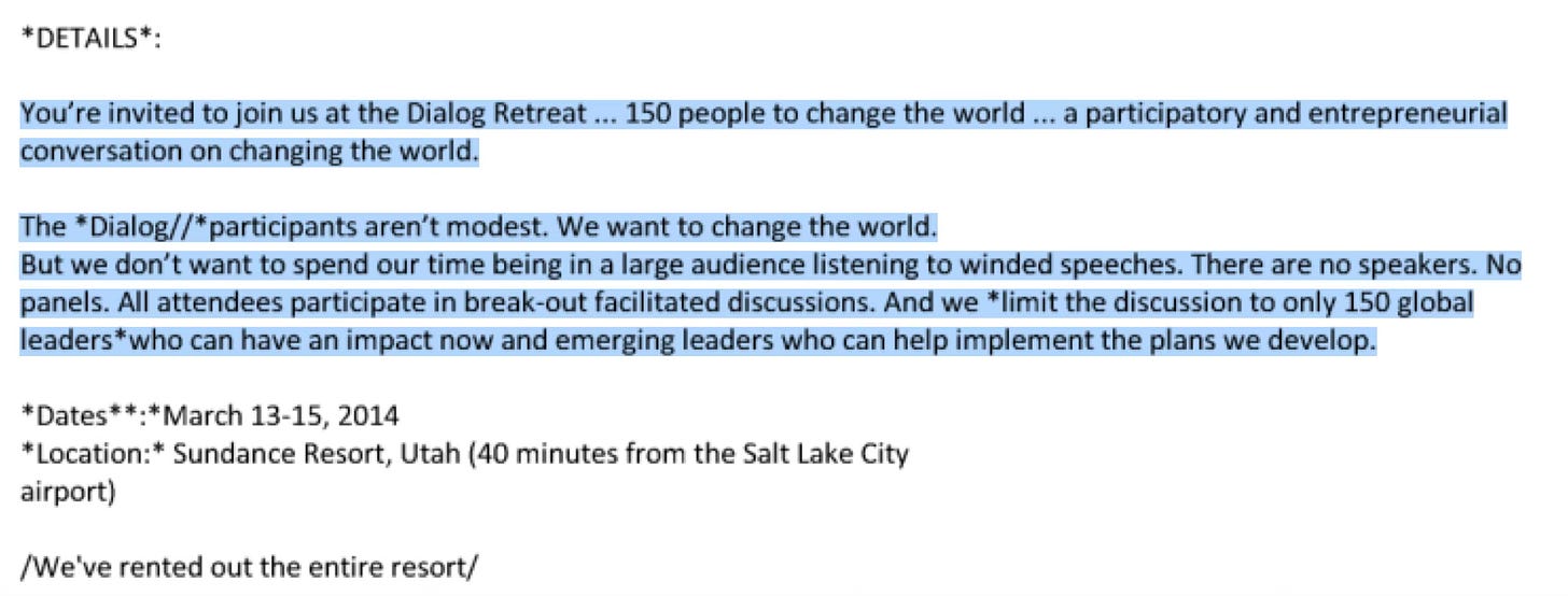 Axios, reporting on this secretive retreat reported in 2025, “Dialog, often compared to a tech-era Bilderberg, has quietly become one of the most elite, and mysterious, gatherings for CEOs, elected officials, and intellectual heavyweights.”